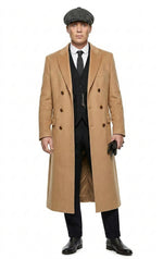 Camel brown double breasted wool overcoat inspired by Peaky Blinders style, featuring a classic lapel collar, long length design, and tailored vint...