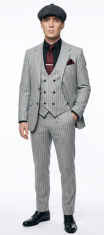 View full detailsChannel timeless vintage style with this Men’s Light Gray Pinstripe 3 Piece Suit inspired by classic Peaky Blinders fashion. Designed with sharp ta...