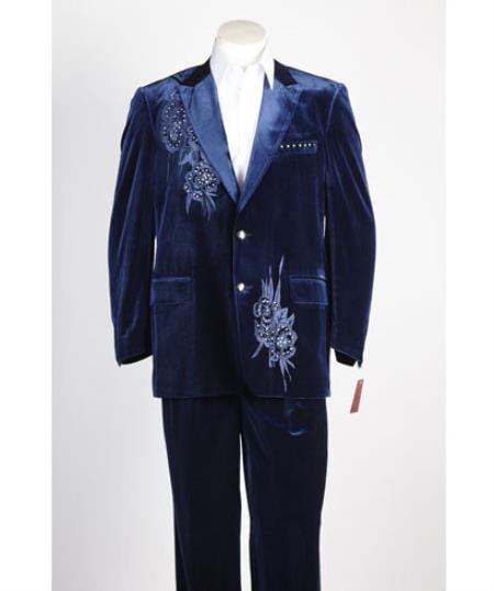 Velour Men's blazer Jacket Men's 2 Button Midnight Blue ~ Navy Velvet Jacket, With Floral Pattern, Satin Peak Lapel, And Black D