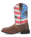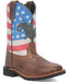 8″ Leather Boot; Brown Foot; American Flag Shaft With Bull Rider Motif; Leather Pull Tabs For Easy On; Textile Lining; Removable Cushion Orthotic Insole; Oil Resistant Rubber Outsole; 1″ Stockman Heel; Broad Square Toe; Style #DPC2823