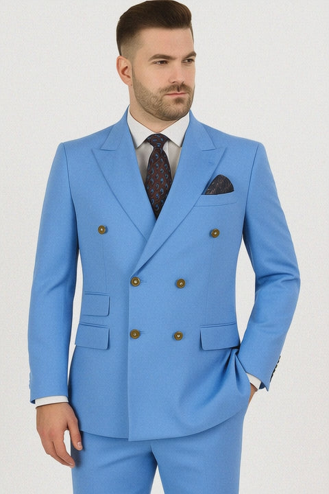 Tailored from high-quality fabric, the blazer features a structured double-breasted front with peak lapels, six bold metallic buttons, and a trim, slim fit that accentuates the torso and shoulders. The light blue color adds a refined pop of color, ideal for spring and summer events, business functions, or stylish social outings.