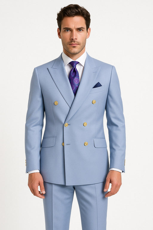 Mens Light Blue Double-Breasted Suit with Gold Buttons – Slim Fit 2-Piece Formal Set in Sky Blue Color
