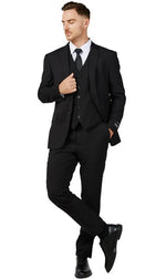 Mens Solid Black Single Breased Notched Lapel Suit Slim Fit Flat Front Pants