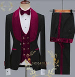 Wide Shawl Lapel Tuxedo - Wedding Groom Black & Burgundy - Vested With Bowtie