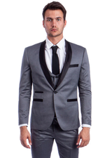 PROMTUXEDO$225.00Original price $225.00 - Original price $225.00Original price$225.00 - $225.00Current price $225.00| /Low stockMens Vested Wool Tuxedo in Shawl Lapel with Satin Trim in Grey & Black This tuxedo is perfect for any prom or wedding, or just about any speci...