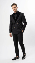 Wedding grey tuxedo MEN'S MODERN FIT TUXEDO SUIT WITH DOUBLE BREASTED VEST AND SATIN TRIM IN CHARCOAL GREY