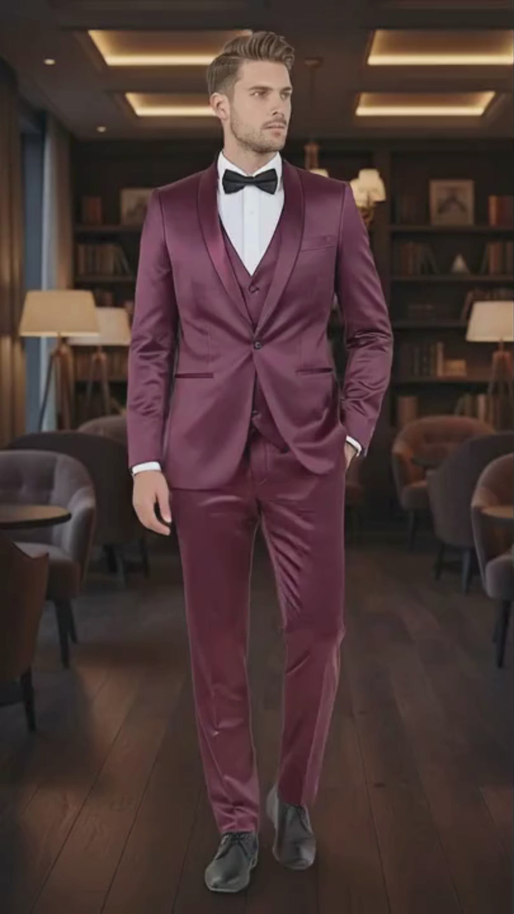 Mens Sateen Shiny Burgundy Slim Fit Tuxedo – Satin Shawl Lapel 3-Piece Suit