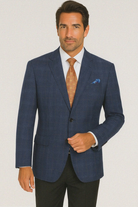 Renoir Men's Classic Fit Wool-Linen Blazer in Blue Windowpane Plaid