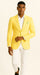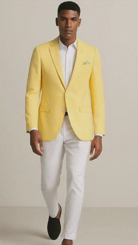 The slim-fit cut delivers a clean, tailored silhouette, while the 2-button front, notch lapel, and side vents ensure mobility and comfort throughout the day. The lemon yellow color adds a vibrant, fashion-forward touch that pairs easily with white, beige, or light blue trousers.