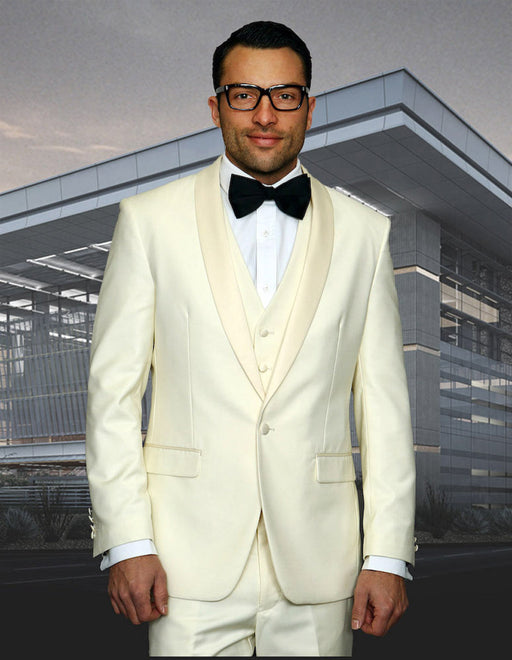 Mens Wool One Button Modern Fit Vested Shawl Prom Tuxedo in Ivory