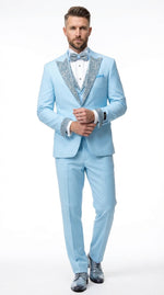 Mens Light Blue 3 Piece Prom Tuxedo – Sky Blue Formal Suit with Sequin Lapel Wedding Party Tuxedo Set in Baby Blue