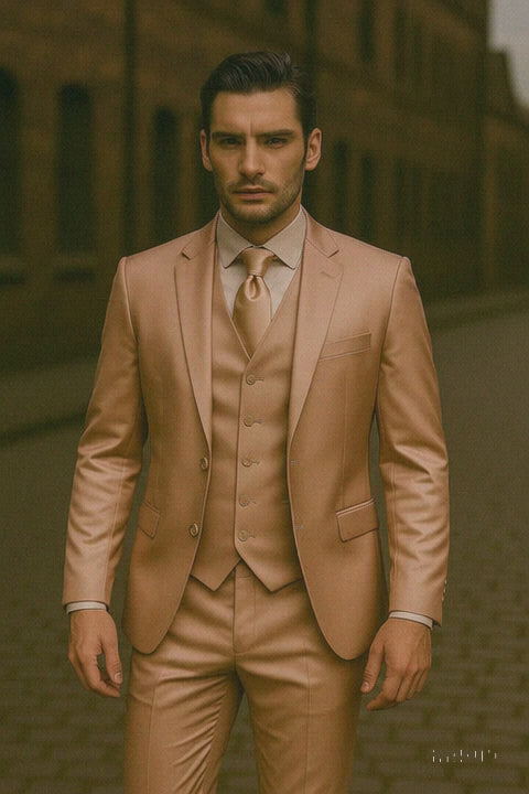• Men’s Shiny Tan Sateen Vested Suit, a sleek and sophisticated ensemble crafted for the man who knows how to shine. Whether you're attending a wedding, prom, gala, or upscale dinner party, this tan 3-piece slim-fit suit brings together modern fashion and timeless elegance with a high-sheen finish that turns heads for all the right reasons.