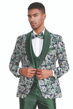 Mens Green and Black Brocade Tuxedo Suit – 3 Piece Floral Jacquard Outfit for Weddings and Formal Events - Slim Fitted