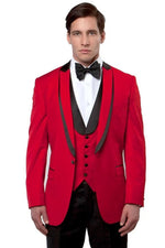 Men's One Button Satin Trimmed Peak Lapel Vested Fancy Tuxedo In Red