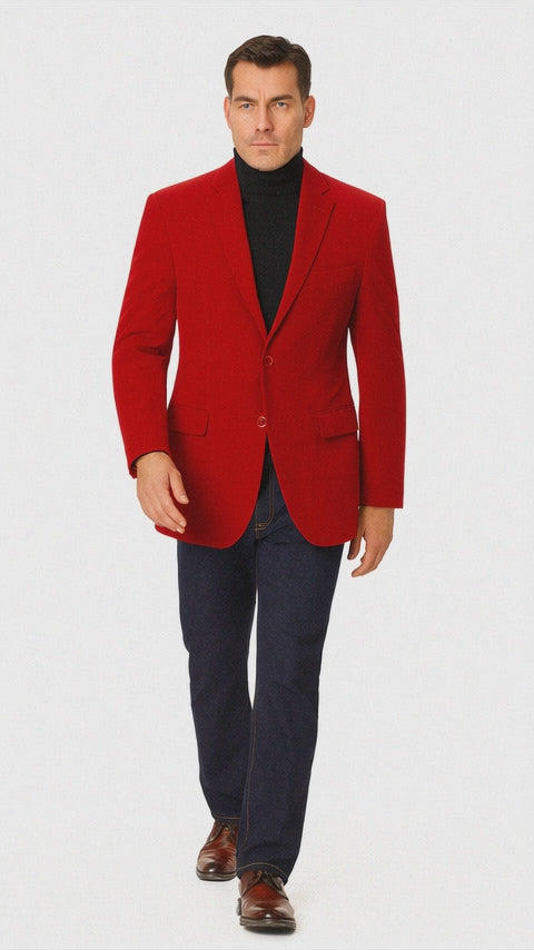 Turn heads and make a bold statement with the Vinci Men's Red Velvet 2-Button Blazer, a striking addition to any modern gentleman’s wardrobe. Designed for those who appreciate classic tailoring with a luxurious twist, this regular-fit blazer combines timeless elegance with rich texture and contemporary flair. Whether you're dressing for a formal event, a night out, or a stylish holiday party, this red velvet jacket adds just the right amount of sophistication and drama.