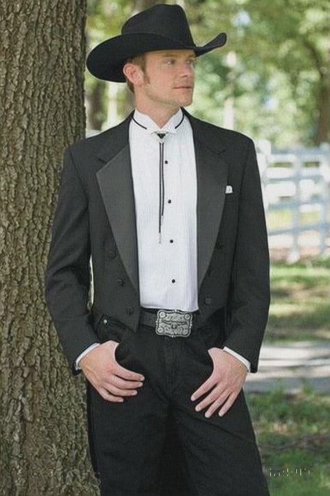 - The rich black color offers versatile styling for both day and evening events, easily matching with boots, bolo ties, cowboy hats, and other Western accessories. This piece is a favorite among men looking to blend classic wedding tuxedo styling with a bold Southern twist.