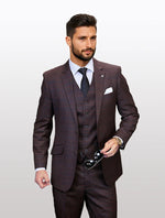 Statement Men's Charcoal and Burgundy Windowpane 100% Wool Vested Suits