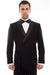 - This double breasted tuxedo comes in a slim fit with black satin peak lapel and black satin covered buttons, side vents, and flat front pants.