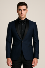 Mens One Button Shawl Tuxedo with Paisley Scoop Neck Vest in Indigo Blue