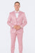 Men's pink slim fit tuxedo with peak lapel. Four piece set. This fashionable tuxedo is made of a luxurious rayon viscose/ dacron blend fabric. Set comes with full back vest. Jacket has two front flap pockets . Jacket pockets are usable but come sewn shut. Gently cut open to use. Fully lined. Very high quality and well constructed. Comes with tapered trousers, jacket, and matching bow tie Pants come unfinished at the bottom so that you can hem at your proper length. This tuxedo is ideal for weddings, proms, black tie, and other formal events. Dry clean only.